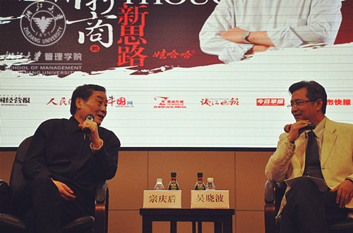 在最后的对话环节,管理学院院长吴晓波教授与宗庆后先生一同探讨了很多有关年轻人该如何抓住机遇,调整心态,不怕吃苦,不断创造的话题。
