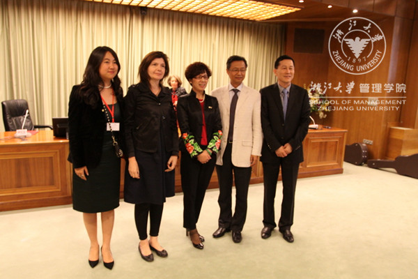 管理学院院长吴晓波、零点咨询集团副总裁冯晞、万事利董事局主席屠红燕与西班牙知名女企业家合影