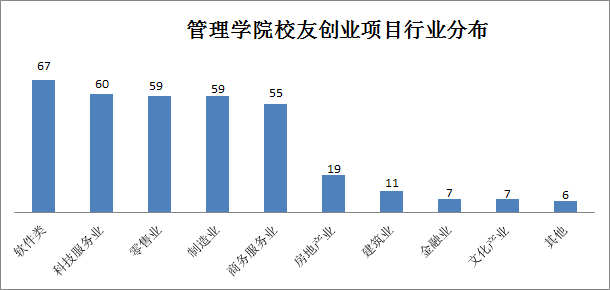 从管院校友创业项目的行业分布看,软件类(19%)、科技服务业(17%)、零售业(17%)、制造业(17%)、商务服务业(17%)分列前五位。此外还有一些分布在房地产、建筑、金融、文化产业等。