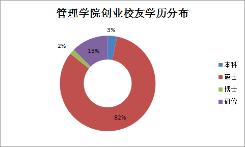 从管院校友的学历分布看,本科学历校友和博士学历校友创业占比均为3%。硕士学历校友是管院校友创业的绝对主力军,占到总创业者人数的82%,管理学院是商学+平台,吸引了大批具有专业背景人才来深造硕士系统学习管理知识。此外,曾在浙大管院高级培训中心以及研究生课程进修班等系统培训的创业校友占13%左右。