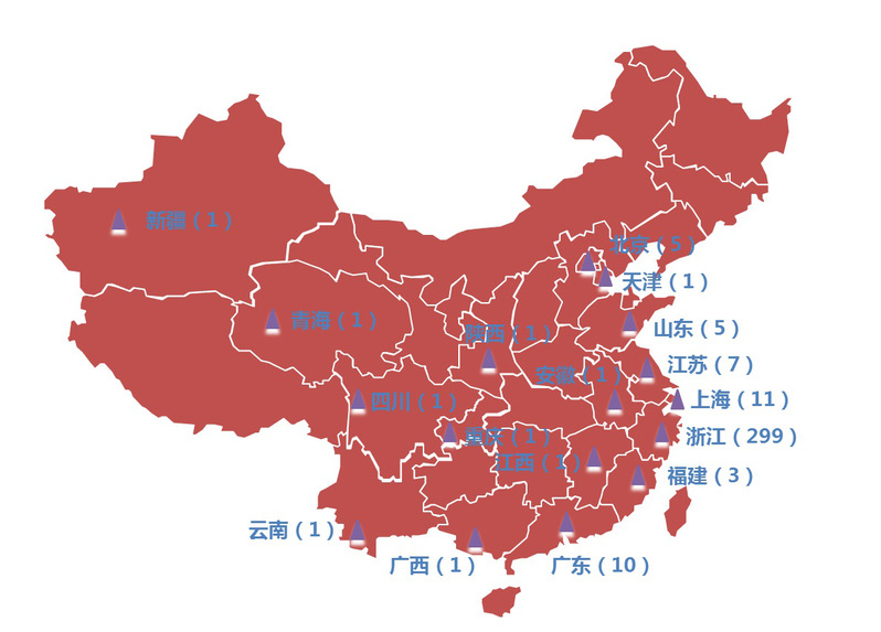 从地理分布看,长三角、珠三角等东部沿海地区是浙大管院校友创业的沃土,特别是浙江省,在350个样本中,有299家在浙江省。这也侧面反映出民营经济发达、素有创业传统和创业精神的浙江省确实是创新创业的沃土。