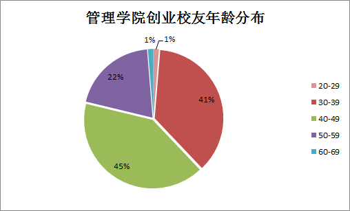 从管院校友创业者年龄分布看,30-39岁(41%)和40-49岁(45%)校友占到创业者总数的86%左右。30-49年龄段是创业主力军。此外,还有23%的创业校友是50岁以上创业者。
