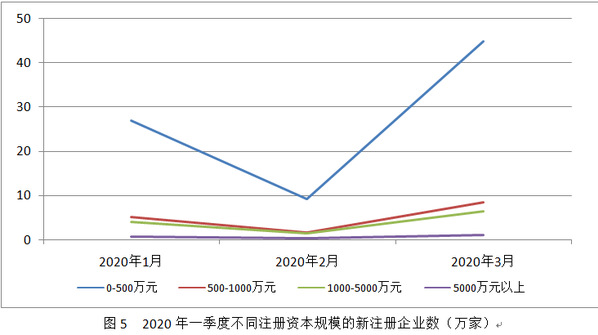 从分月情况看,2020年3月份不同注册资本规模的新注册企业数量较前两个月都有明显增加,其中,注册资本低于500万元的新注册企业数比1月和2月新注册企业的总和增加了24.3%;注册资本500万~1000万元的新注册企业数比1月和2月总数增加了26.2%;注册资本1000万~5000万元的新注册企业数增加15.4%;注册资本5000万元以上的新注册企业数几乎是前两月新注册企业的总和。
