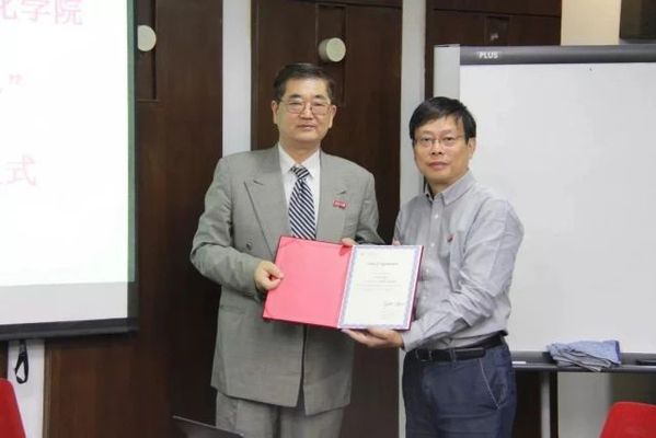 韦德官方站网页版党委书记兼副院长朱原(右)为郭玉贵(左)颁发浙江大学特聘研究员聘书并佩戴浙大校徽