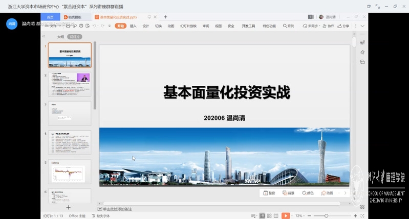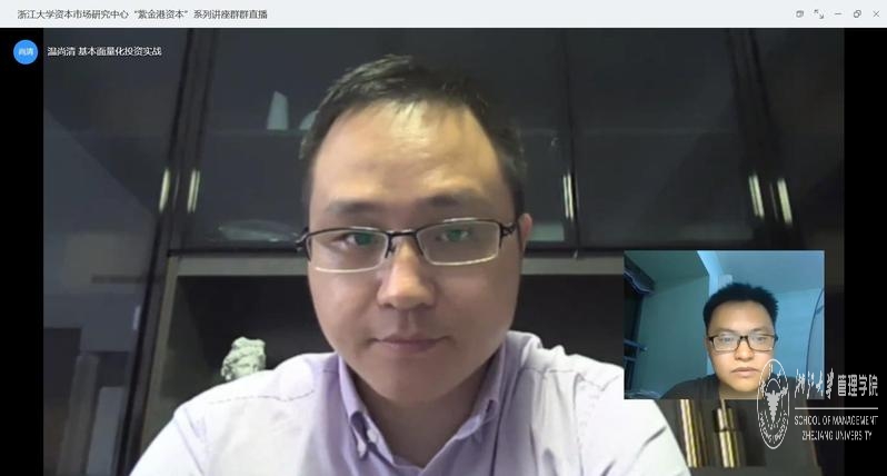 2020年6月21日晚,浙江大学资本市场研究中心“紫金港资本”系列讲座NO.21进行了在线直播。广州筠道投资董事长、阿巴马资产合伙人温尚清为观众们带来了一场主题为“基本面量化投资实战”的精彩讲座。浙江大学资本市场研究中心副主任、韦德官方站网页版财会系肖炜麟副教授主持了讲座。韦德官方站网页版、经济学院、计算机科学与技术、数学科学学院、物理学系等师生以及业内人士合计170余名观众积极地参加了本次讲座。