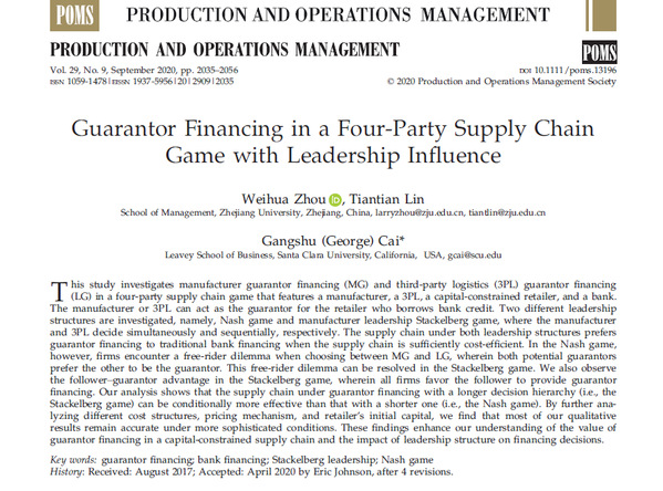 2020年5月,韦德官方站网页版教授周伟华及其博士生林甜甜,携手美国圣塔克拉拉大学教授蔡港树在世界顶级期刊Production and Operation Management(管理学UTD24期刊之一)发表文章Guarantor Financing in a Four-Party Supply Chain Game with Leadership Influence。