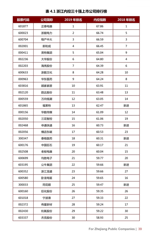 正泰电器、浙能电力和物产中大为浙江上市公司内部控制前三强。福莱特、申通快递、泰格医药、公牛集团和同花顺首次进入内控三十强。