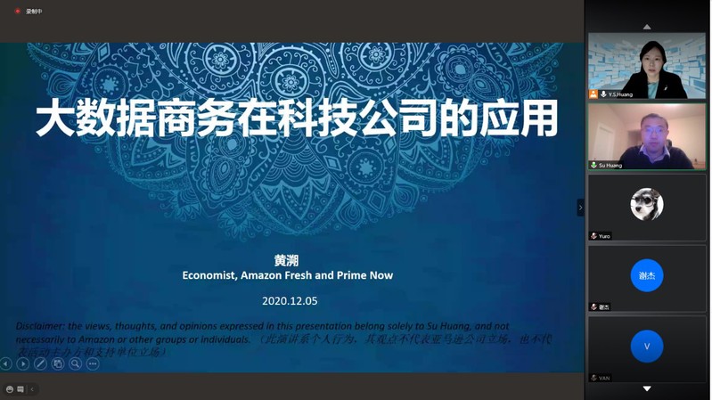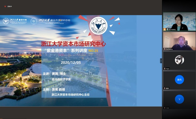 2020年12月5日上午,浙江大学资本市场研究中心“紫金港资本”系列讲座NO.25以线上讲座的模式进行。亚马逊经济学家黄溯博士为观众们分享主题为“大数据商务在科技公司的应用”的精彩讲座。浙江大学资本市场研究中心主任黄英教授主持了讲座。会计学、金融学、统计学、工商管理、管理科学与工程等专业的国内外高校师生,以及银行、证券、投资、电子商务等行业人士,合计170余名观众报名参与了本次讲座。