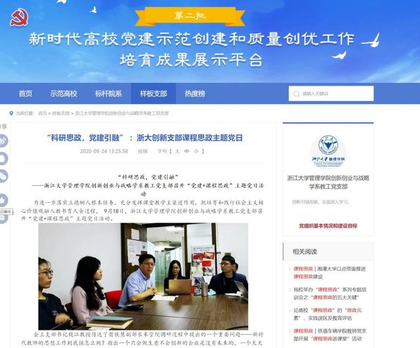 在服务国家战略、打造双创金课、党建引领“双一流”学科建设以及高层次创新创业人才培养等方面,创新系教工党支部也取得可喜成果。例如:“全面创新管理”等原创理论得到学术界和政府部门的重视,多项成果要报获得省部级领导批示;由支部副书记郑刚教授开发的《创新管理》等多门课程入选国家一流本科课程、国家精品在线开放课程,并入选中宣部《学习强国》平台;支部骨干获得国家自然科学基金创新研究群体项目、国家自然科学基金重点项目、国家社科重大项目、教育部哲学社会重大招标项目等各类资助;支部老师指导学生获得多项国家级创新创业大赛金奖等。