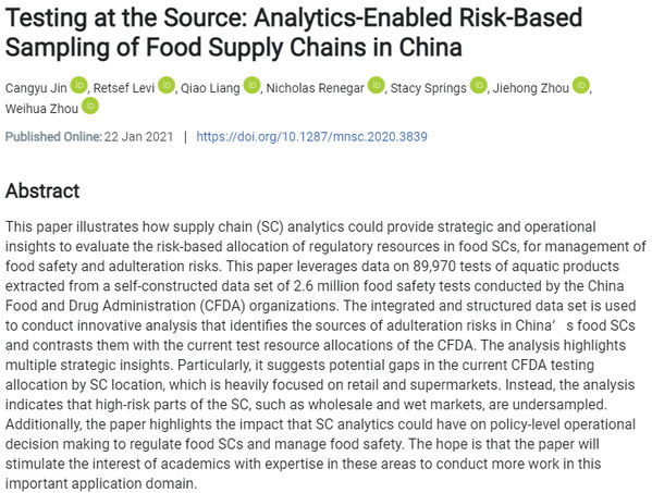 经过深入详细的研究调查,以及对海量检测数据的分析,由中美双方团队共同撰写的学术论文Testing at the Source: Analytics-Enabled Risk-basked Sampling of Food Supply Chains in China被Management Science 期刊(管理学UTD24期刊之一)收录,并于2021年1月22日在线发表,这是首篇以浙江大学为第一署名单位发表在该期刊上的论文。