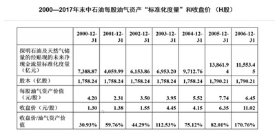 用经贴现的未来净现金流量标准化度量除以股本计算得到每股油气资产价值,从表格可见,巴菲特在2001年用1.3元购买了价值4.2元的股票,而在2007年将价值6.45元的股票用11.02元卖出去。