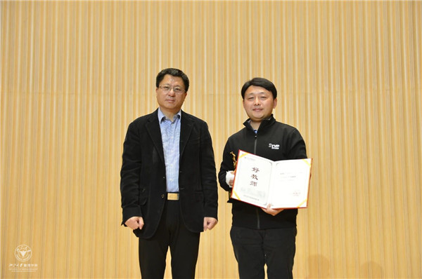 韦德官方站网页版院长魏江(左)为“好教师”郑刚(右)颁发奖杯与证书