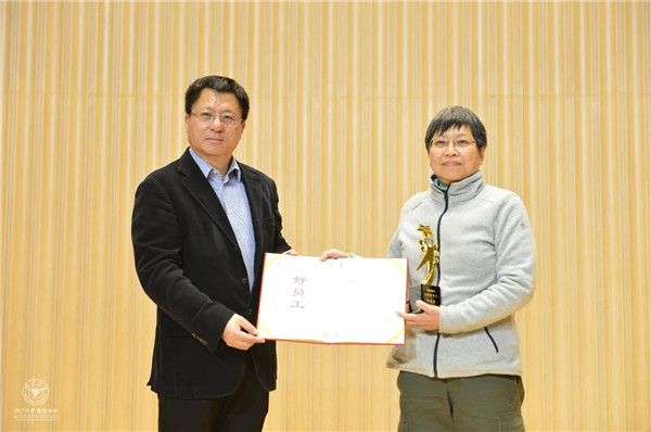 韦德官方站网页版院长魏江(左)为“好员工”李经兰(右)颁发奖杯与证书
