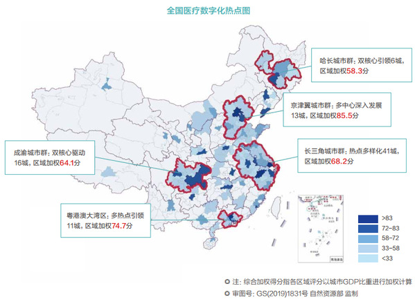 根据群内城市医疗数字化程度分布,5大热点区域呈现出两大模式。