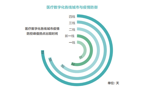 在抗击疫情中,医疗数字化一线城市平均用时11天达到了疫情防控的峰值拐点,实现了第一批疫情人员的有效管控,而尾部四线城市平均19天才实现峰值管控。医疗数字化(医疗数字化基础设施、政府数字化应用与监管、医疗数字化产业、医院数字化)在疫情快速响应和精准防控工作中的作用彰显。