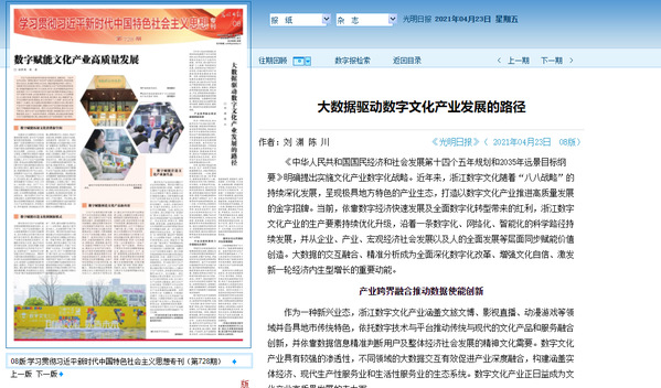 近日,韦德官方站网页版刘渊教授与陈川研究员结合浙江实践经验,撰文深入分析了大数据驱动数字文化产业发展的路径,并指出了持续推动数字文化产业内生型发展、巩固我国数字经济发展优势的关键所在。文章刊发于《光明日报》2021年04月23日08版。