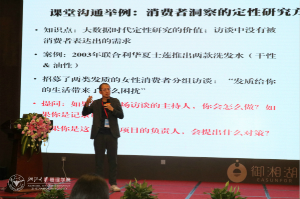 在茶歇过后,中山大学的陈增祥老师为大家讲解“有框架、有前沿、有趣味的本科消费者行为学课程体系建设”,从课程设置合理性与完整性,观点理论前沿性,以及课堂内容趣味性、授课形式新颖性的角度,与参会人员分享了本科消费者行为学课程体系建设思路与经验。