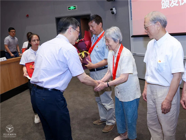 抚摸着胸前沉甸甸的纪念章,老党员们难掩激动。陈天来代表获得纪念章的老党员向党中央的关怀厚爱表达由衷的感恩,向学校、学院党委的关心爱护表达诚挚的谢意。作为一名老共产党员、一名“西迁二代”,陈天来表示自己将发挥余热,继续为党和人民、为浙大“第二故乡”湄潭的教育事业发展做出贡献。他以自己的成长经历勉励同学们,遇到困难不放弃、不退缩,永远忠于党和人民。
