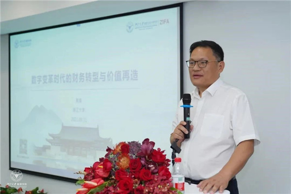 随后,陈俊教授代表浙大-物产中大省级产学合作协同育人项目组发言,并作“数字变革时代的财务转型与价值再造”的“开学”报告。他指出,当下正是人工智能和实体经济加速融合、产业升级和数字创新依存共生的时代,新一代智能技术的发展推动财务向智能化转变,数字化转型带来的降本增效、业务优化、战略协同、集中管控、资源整合等价值日益明显。他强调,智能财务正在重构财务的管理角色和职能价值,未来的数字时代变革并非只是技术的变革,更是认知、组织、思维模式的变革,未来的财会人员必须充分认识到这点,并随之变革,成为具备跨界复合型能力的高级财务管理人才。