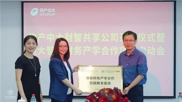 为进一步推进项目落地,深化产教融合,致力人才培养,双方决定共同成立“智能财务产学合作实践教育基地”和浙江大学-物产中大产学合作项目组。朱原书记和物产中大集团财务总监、财智公司执行董事王奇颖共同为实践教育基地揭牌。
