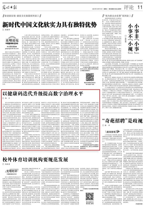 目前已有部分地区正在探索尝试健康码的迭代升级。韦德官方站网页版助理研究员、浙江数字化发展与治理研究中心研究员陈川对此也有深入思考与研究。日前,他撰文《以健康码迭代升级提高数字治理水平》为“数字中国”建设献言献策。文章发表于2021年10月15日《光明日报》第11版。