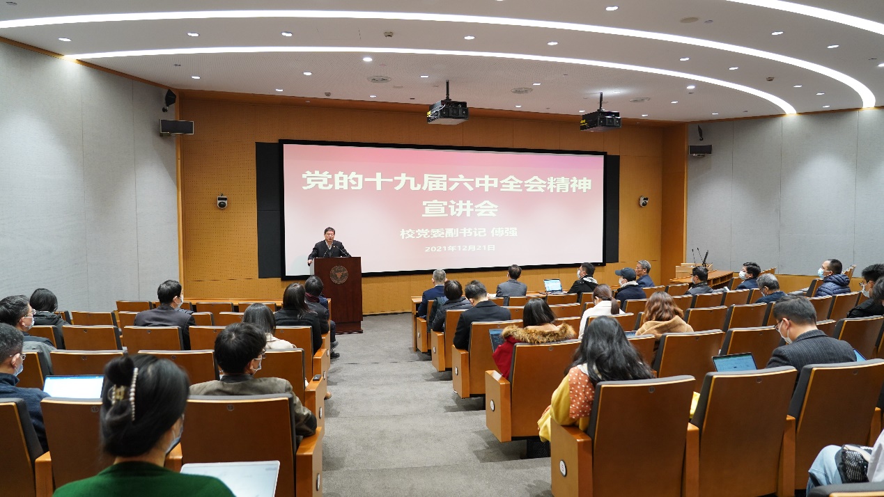 浙江大学党委副书记傅强在宣讲时强调,要深刻领会党的十九届六中全会提出“两个确立”,推动全党实现政治上高度团结、思想上空前统一、组织上坚强领导、作风上全面过硬、战略上坚定清醒的里程碑意义。他强调,要明确心怀“国之大者”、奋力“走在前列”的工作主题主线,始终保持奋进者的姿态,“赶考者”的清醒,奋力开创中国特色世界一流大学建设新局面。结合学校党委贯彻落实十九届六中全会精神举措,他对管理学院如何“走在前列”提出几点希望: