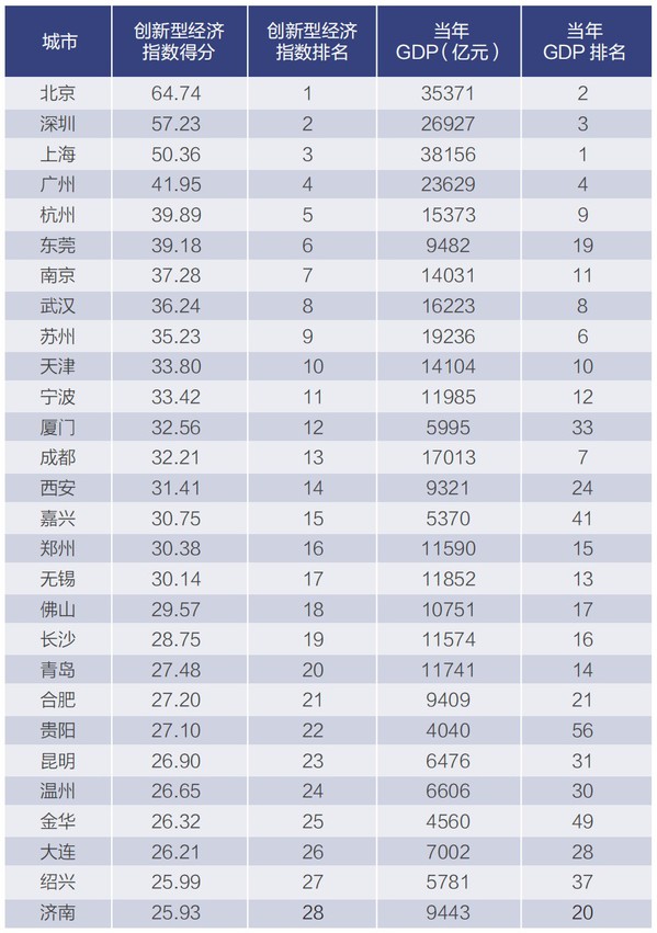 “中国57城”创新型经济指数榜单