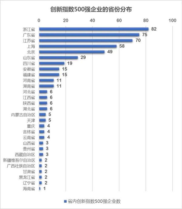 从省份分布来看,创新指数500强企业数量排名前七的省份分别是浙江省(82家)、广东省(共75家)、江苏省(70家)、上海市(58家)、北京市(49家)、山东省(29家)、四川省(19家)。