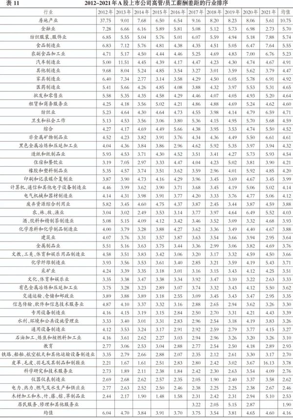 由表11可知:2012 ~ 2021年A股上市公司高管/员工薪酬差距的均值为4.16倍;从行业分布来看,房地产行业和金融行业薪酬差距较大,薪酬治理问题较为突出⑪。