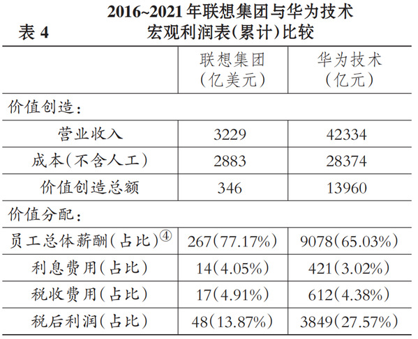 从表4可以看出,联想集团2016~2021年员工总体薪酬占期间内价值创造总额的77.17%,高于华为技术的65.03%。这从表面上看似乎与前文的结论不符,实则不然,主要原因在于:(1)该指标为价值分配相对指标,是由于联想集团价值创造能力较弱,导致该比例显得较高。(2)由于华为技术股权系全体员工所有,因此华为技术员工享有华为技术价值创造总额的真实比例为表4中“员工总体薪酬占比+税后利润占比”,即“65.03%+27.57%=92.6%”;(3)联想集团存在高度不平衡的薪酬体系(高管与非高管薪酬差距非常大),后文将进行阐述与分析。
