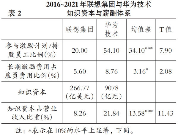 因此,判断一家企业对知识资本的重视程度,可以通过其构建的薪酬治理体系加以辨析。本文通过手工搜集年报数据,初步勾勒出联想集团和华为技术的知识资本与薪酬体系,如表2所示。