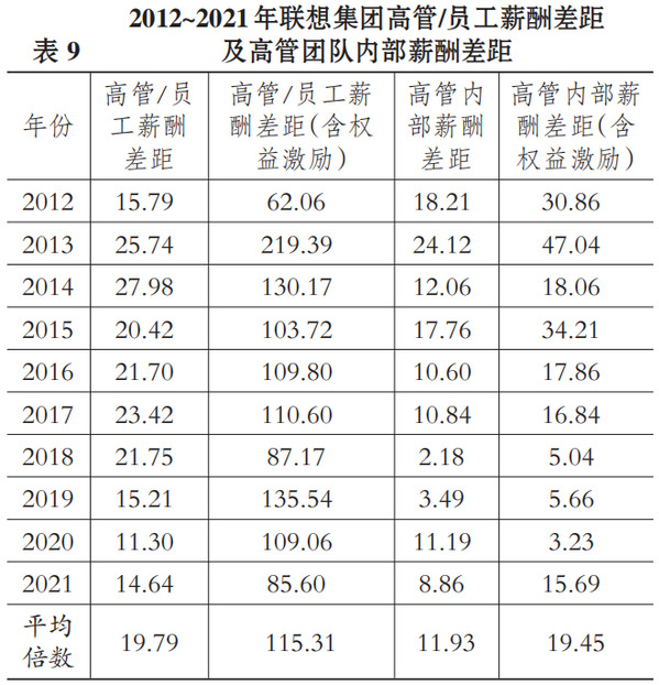 表9反映了2016~2021年联想集团高管/员工薪酬差距以及高管团队内部薪酬差距情况⑧。2012~2021年联想集团高管/员工的平均薪酬差距大致保持在20倍水平;在考虑高管权益激励费用后,发现高管/员工平均薪酬差距进一步拉大,2013年甚至达到惊人的219.39倍。