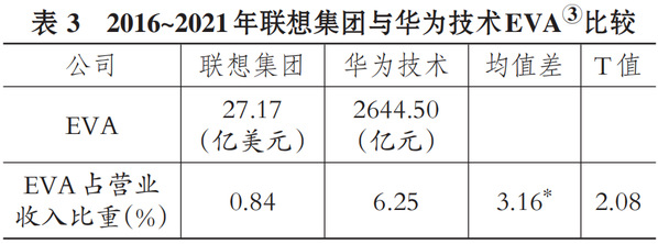 经济增加值(EVA)拓展了传统的剩余收益评价方法。从表3可见,联想集团2016~2021年累计EVA为27.17亿美元,换算成人民币约为182.28亿元②,同期华为技术累计EVA达2644.50亿元,反映出两家公司价值创造能力存在显著差异。