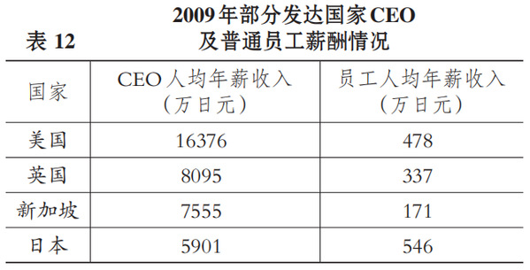 从表12可以看出,2009年日本普通员工人均收入达到546万日元,是同期美国普通员工人均收入的1.14倍、英国的1.62倍、新加坡的3.19倍。在员工人均收入超过英美的同时,高管人均收入保持了较低水平,2009年CEO人均收入为5901万日元,是同期美国CEO人均收入的36.03%、英国的72.90%、新加坡的78.11%。由此可见,虽然日本从明治维新以来一直学习美国的经济制度,但薪酬差距并没有向“国际高水平”看齐。