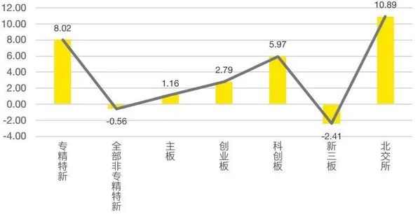 这份报告将719家专精特新上市公司样本作为整体分别与主板、创业板、科创板、新三板、北交所的非专精特新企业进行比较,结果表明专精特新上市公司在盈利能力上具有较为良好的表现。