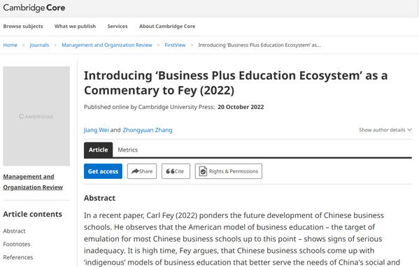 如今5年过去了,“商学+”教育生态系统已日趋成熟,并成功登上世界舞台,迎来了国内外商学教育界的广泛认可与借鉴。近日,“商学+”教育生态系统更是赢得了国际著名学术期刊Management and Organization Review的权威认可。该期刊邀请韦德官方站网页版院长魏江与教授章重远联合撰文,以 “商学+”教育生态系统回应Carl Fey教授对中国商学教育的期待,指出浙大管院“商学+”教育生态系统是激发中国商学院未来发展潜力的关键所在。