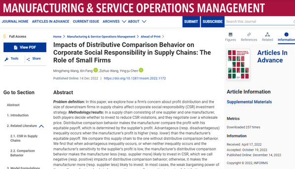 近几年,尽管很多制造型大企业在努力担负起社会责任,但其零部件供应商等中小微企业却频频出现违反企业社会责任的行为。王明征教授团队注意到了这一现象,他们提出可以通过调整产品的批发价去改变中小微企业的分配比较行为影响,为解决中小微企业不愿承担企业社会责任的难题提供新思路和解决方案。
