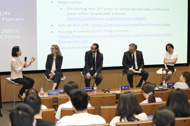 主题讲座之后,四位联合国嘉宾进行了以“联合国工作经验”为主题的圆桌论坛。大家分别围绕进入联合国工作的契机、在联合国工作的收获等问题分享了自己的经验、看法,同时在技能要求、准备工作、求职渠道等方面为有志向进入联合国或其他国际组织工作的在场学子们提出了宝贵意见和建议。