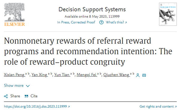 近日,浙大管院王求真教授、彭希羡研究员,携手管院博士生邢妍、费梦琪等共同完成的论文——Nonmonetary rewards of referral reward programs and recommendation intention: The role of reward–product congruity,在线发表于信息系统领域国际高水平学术期刊Decision Support Systems上(国际信息系统协会AIS认定的CSS顶级期刊之一)。