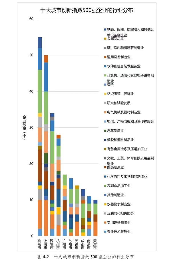 在行业分布上,10大创新型企业集聚城市均拥有属于计算机、通信和其他电子设备制造业的创新指数500强企业,且企业数量占城市内500强企业总数的比例均超过10%。