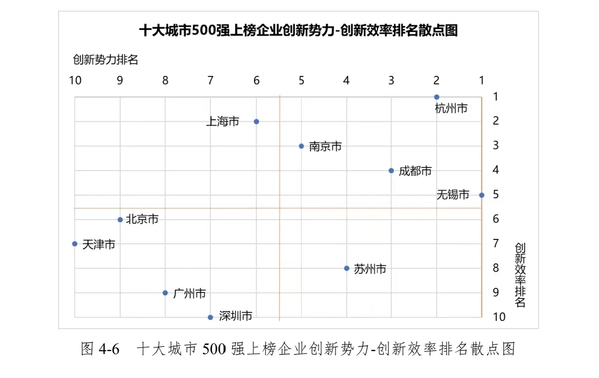 可见,杭州、南京、成都、无锡等城市的500强上榜企业在创新势力和创新效率上平均表现较为均衡且优于平均。北京的500强上榜企业在创新势力和创新效率上平均表现也较均衡但逊于平均。上海的500强上榜企业在创新效率方面表现较好,但创新势力有待提高。