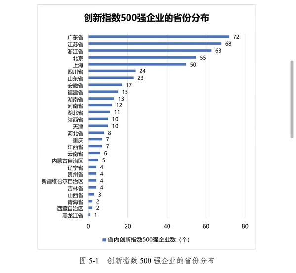 从省级分布来看,广东省的创新指数500强企业数最多,江苏和浙江分列第二、三位。值得注意的是,四川省自2017年以来首次在创新指数500强企业数目上进入全国前6省市名单。