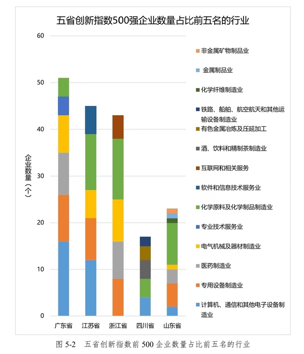 各省份企业数目占比前五的行业也具有一定特色。例如,广东省与浙江省的医药制造业企业数量均排名前列。四川省的计算机、通信和其他电子设备制造业,化学原料和化学制品制造业,酒、饮料和精制茶制造业的企业数量并列第一。山东省上榜企业数量占比前五名的行业相对分散,除化学原料及化学制品制造业的企业之外,还有一定数量的企业分属于专用设备制造业和医药制造业等。