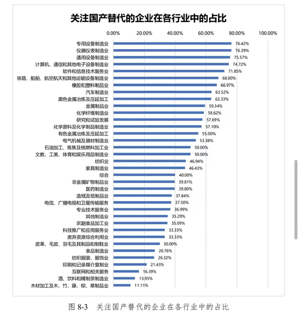 在样本涉及的36个二级细分行业中,有17个行业关注国产替代的企业占比超过50%。在一些行业中,超过70%的企业关注国产替代,例如:专用设备制造业,仪器仪表制造业,通用设备制造业,计算机、通信和其他电子设备制造业,软件和信息技术服务业。这表明国产替代正成为中国本土企业所关注的重要趋势。