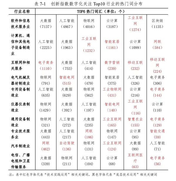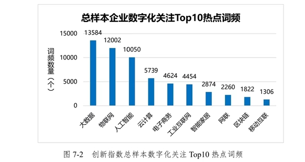 可以发现,数字技术本身仍是上市公司最重视的领域,大数据、物联网、人工智能和云计算等底层技术是企业开展数字化转型的重要基石。此外,数字技术的应用在一些场景相对较为成熟,如电子商务、工业互联网、智能家居和金融科技等。