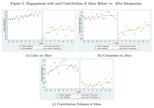最终他们研究发现,休闲内容(“想法)与严肃知识内容(“回答”和“文章”)的整合,导致该平台用户浏览和阅读行为都显著减少。