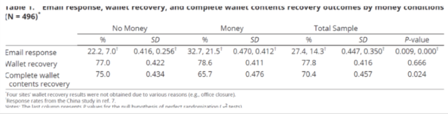 通过“电子邮件回复率”和“钱包回收率”双重指标开展中国公民诚信度实验研究,周欣悦及其合作团队发现,如果仅用电子邮件回复率来衡量“诚实”,结论与Cohn等人的研究结果相似,但电子邮件回复率(27.4%)远远低于钱包回收率(77.8%),说明 “电子邮件回复率”无法真实反映公民的诚实程度。由此可见,如果以“钱包回收率”来作为衡量指标,中国公民诚实水平比Cohn等人的研究结论要高很多。