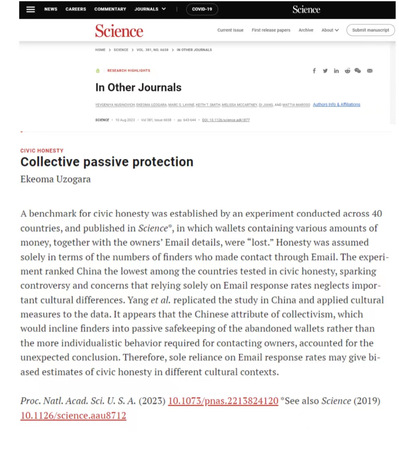 4年前,国外研究者Cohn等人以此开展研究,通过“电子邮件回复率”度量40个国家的公民诚实度,并于2019年6月在国际顶级期刊《Science》发表了一篇令无数中国人感到震惊的文章——Civic honesty around the globe。该文章声称,中国的公民诚实度排在40个国家的末位。换句话就是说,中国成了这40个国家中诚实度最低的国家。