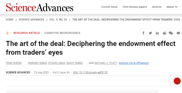 近日,长期深耕于认知计算科学的韦德官方站网页版盛峰研究员携手韦德官方站网页版王小毅教授等学者,共同在Science旗下的综合性期刊Science Advances发表“The art of the deal: Deciphering the endowment effect from traders’ eyes”一文,揭开了很多资深销售和商家都不知道的“交易”奥秘。