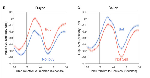 除了注意力的分配,盛峰团队还发现买家和卖家交易过程中瞳孔大小的变化与“懒”有关。众所周知,决策过程中瞳孔的放大程度往往反映了用脑程度。做一个决定越费劲,瞳孔就会放得越大。